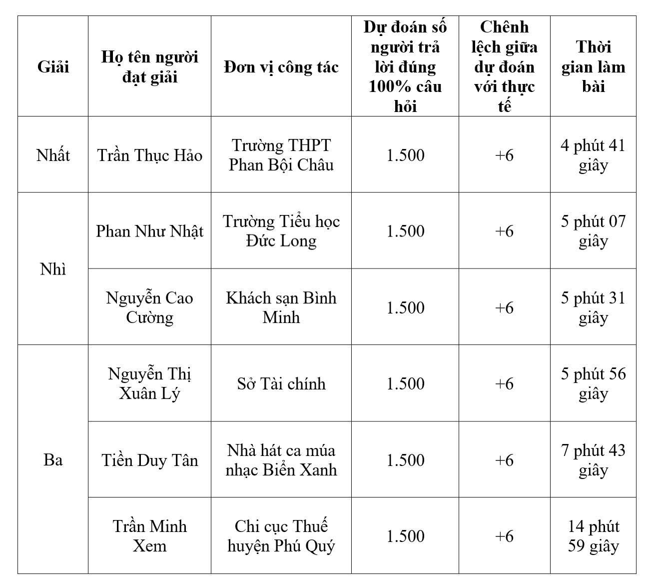Ban Tổ chức cuộc thi xin tuyên dương các cơ quan, đơn vị có lượng thí sinh tham gia nhiều, gồm: Sở Giáo dục và Đào tạo (1.980 người), huyện Bắc Bình (358 người), huyện Hàm Tân (320 người), huyện Phú Quý (289 người), huyện Hàm Thuận Nam (247 người),… Bên cạnh đó, một số cơ quan, đơn vị có lượng thí sinh tham gia còn ít, như Sở Giao thông Vận tải (3 người), Ban Quản lý các Khu công nghiệp (4 người), Công an tỉnh (7 người)...